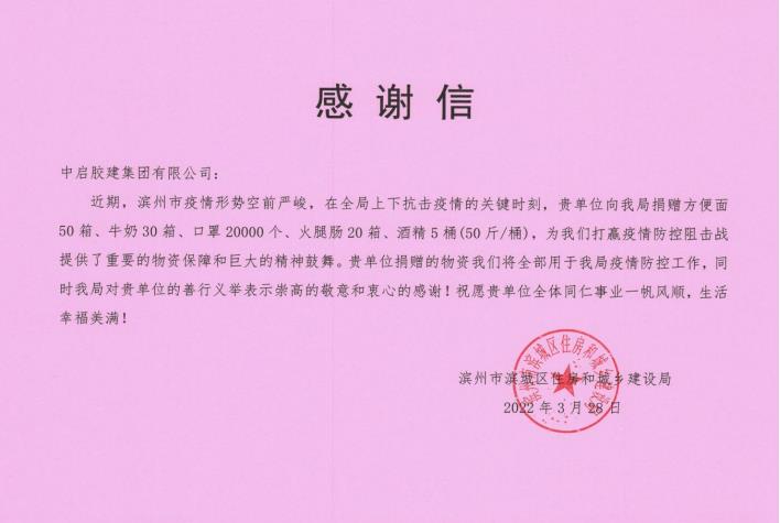 聚合青春正能量,務實篤行顯擔當----中啟膠建集團青島公司防疫工作獲贈錦旗