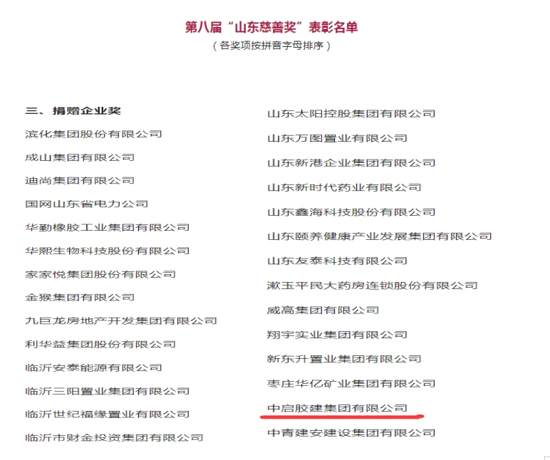 近日,山東省民政廳印發(fā)《關(guān)于表彰第八屆“山東慈善獎(jiǎng)”獲得者的決定》,對2020年10月至2022年12月期間在山東省慈善領(lǐng)域作出突出貢獻(xiàn)的先進(jìn)典型予以表彰,授予100個(gè)愛心個(gè)人、愛心團(tuán)隊(duì)、捐贈企業(yè)、慈善項(xiàng)目第八屆“山東慈善獎(jiǎng)”。其中,慈善楷模10個(gè)、捐贈個(gè)人13個(gè)、捐贈企業(yè)51個(gè)、慈善項(xiàng)目26個(gè)。中啟膠建集團(tuán)有限公司榮獲第八屆“山東慈善獎(jiǎng)”愛心捐贈企業(yè)?!吧綎|慈善獎(jiǎng)”是山東省慈善領(lǐng)域政府最高獎(jiǎng)。