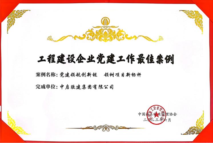 近日,中國施工企業(yè)管理協(xié)會在天津召開2023年工程建設企業(yè)黨建工作成果交流會,中啟膠建集團有限公司黨建工作案例《黨建領航創(chuàng)新鏈,領樹項目新標桿》榮獲中國施工企業(yè)管理協(xié)會“工程建設企業(yè)黨建工作最佳案例”獎,并授予單位“工程建設行業(yè)黨建工作示范單位”稱號。