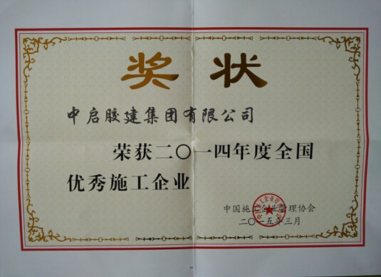 中啟膠建集團(tuán)有限公司憑著優(yōu)異的施工業(yè)績和良好的企業(yè)信譽(yù),繼2013年度連續(xù)兩年榮獲全國優(yōu)秀施工企業(yè)榮譽(yù)稱號。