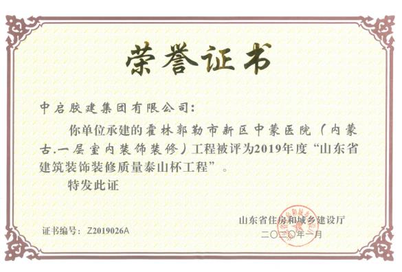 近日,由中啟膠建集團(tuán)有限公司建筑二分公司承建的霍林郭勒市新區(qū)中蒙醫(yī)院工程建設(shè)項(xiàng)目喜獲2019年度山東省建筑裝飾裝修質(zhì)量“泰山杯”獎(jiǎng)項(xiàng)。