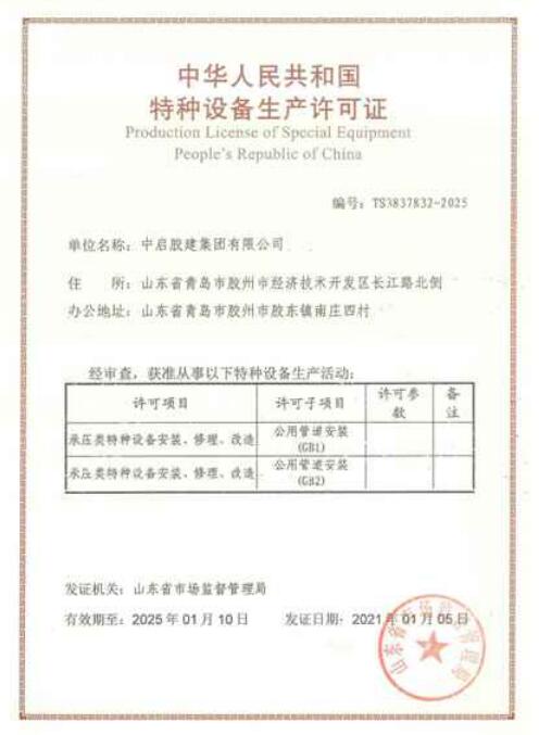 日前,經(jīng)集團(tuán)總工辦公室牽頭,在集團(tuán)各部門和各生產(chǎn)經(jīng)營單位,特別是建筑七公司、建筑九公司的大力支持和共同努力下,中啟膠建集團(tuán)有限公司順利完成公用壓力管道安裝GB2許可升級和GB1許可取證工作。