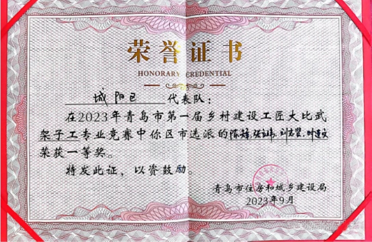 9月22日,青島市首屆鄉(xiāng)村建設(shè)帶頭工匠培訓(xùn)暨第一屆鄉(xiāng)村建設(shè)工匠比武大賽完美落幕,中啟膠建集團(tuán)華東公司代表城陽(yáng)區(qū)選派的參賽選手在比賽中表現(xiàn)突出,成績(jī)優(yōu)異。