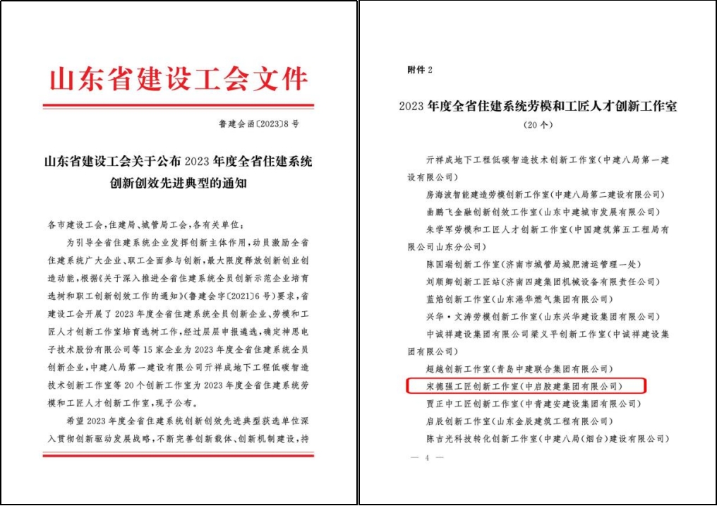 近日,山東省建設(shè)工會委員會公布了20個山東省住建系統(tǒng)工匠人才創(chuàng)新工作室。其中,中啟膠建集團有限公司“宋德強工匠創(chuàng)新工作室”被評為“2023年度山東省住建系統(tǒng)工匠人才創(chuàng)新工作室”。