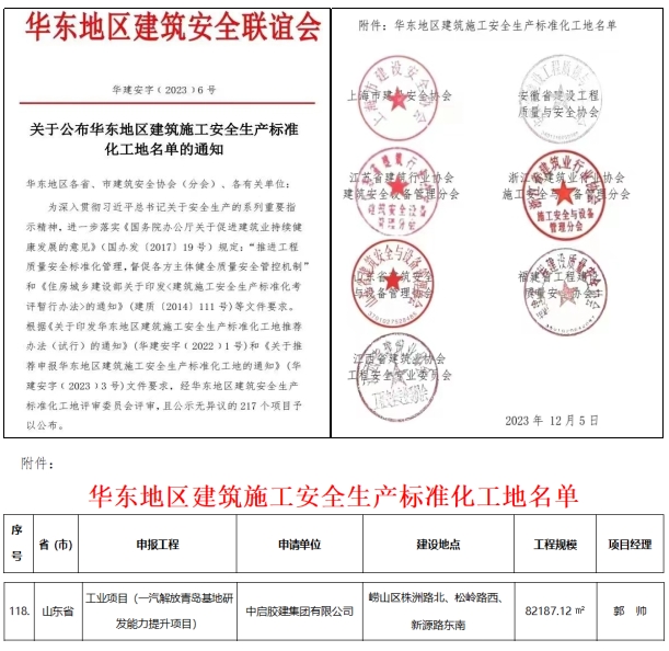 近日,山東省建筑安全與設(shè)備管理協(xié)會公布了華東地區(qū)建筑施工安全生產(chǎn)標準化工地名單,全省僅35個項目入圍,中啟膠建集團承建的一汽解放青島基地研發(fā)能力提升項目榜上有名,榮獲“華東地區(qū)建筑施工安全生產(chǎn)標準化工地”稱號。