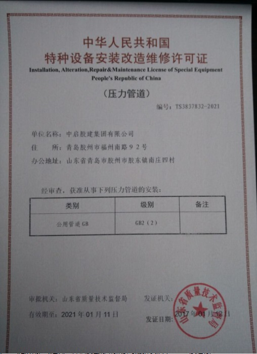 2017年1月12日,中啟膠建集團有限公司通過省質(zhì)監(jiān)局評審,獲得特種設備安裝改造維修許可證公用管道GB2(2)許可證書,公司將以此為契機,進一步拓展公司的業(yè)務范圍,積極參與城市綜合管廊工程,力爭實現(xiàn)突破。